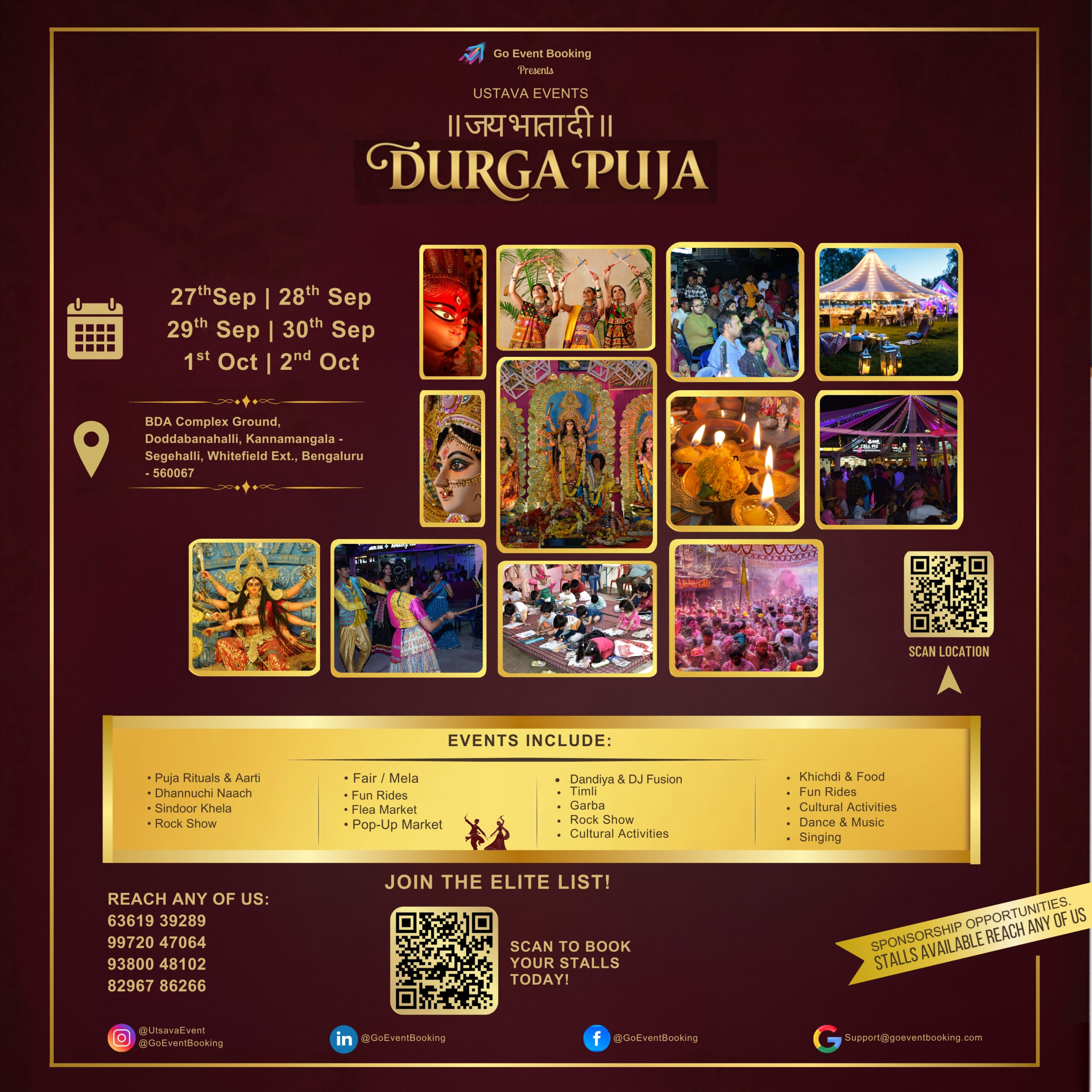 Experience the magic of tradition, culture, shopping, and entertainment at the Durga Puja Flea Market Bengaluru 2025, proudly presented by Go Event Booking and Ustava Events. This vibrant 6-day celebration will take place from September 27th to October 2nd, 2025, at the BDA Complex Ground, Doddabanahalli, Kannamangala – Seegehalli, Whitefield Ext., Bengaluru – 560067.